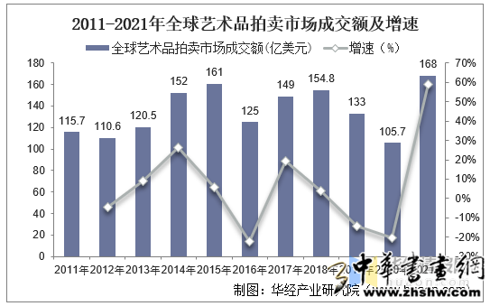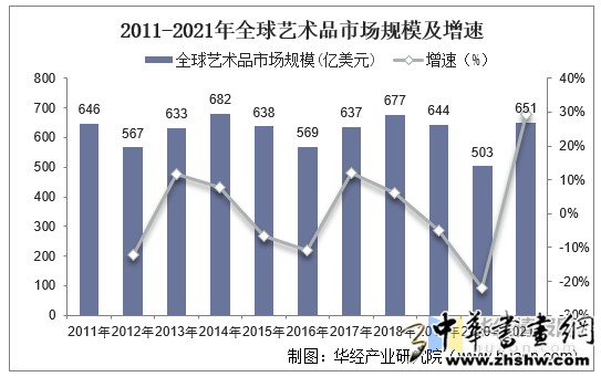 2011-2021年全球艺术品拍卖市场成交额及增速