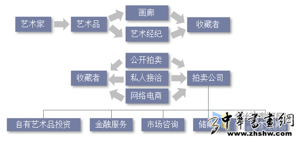 艺术品行业产业链主要由艺术家、画廊和艺术品经纪人、拍卖公司和收藏者构成。艺术家作为艺术品产业链的上游生产者,在特定时期创作出独一无二的艺术作品提供给市场。画廊和艺术经纪人作为艺术品一级市场的主要参与者,为藏家或艺术家搜寻符合条件的交易对象,同时也可签约培养艺术家,筛选、包装,推广合格的艺术品进入市场流通。而拍卖公司作为二级市场的重要平台,从事中介服务,从艺术家和收藏家的手中收购精品,满足广大藏家的收藏和再投资需要。